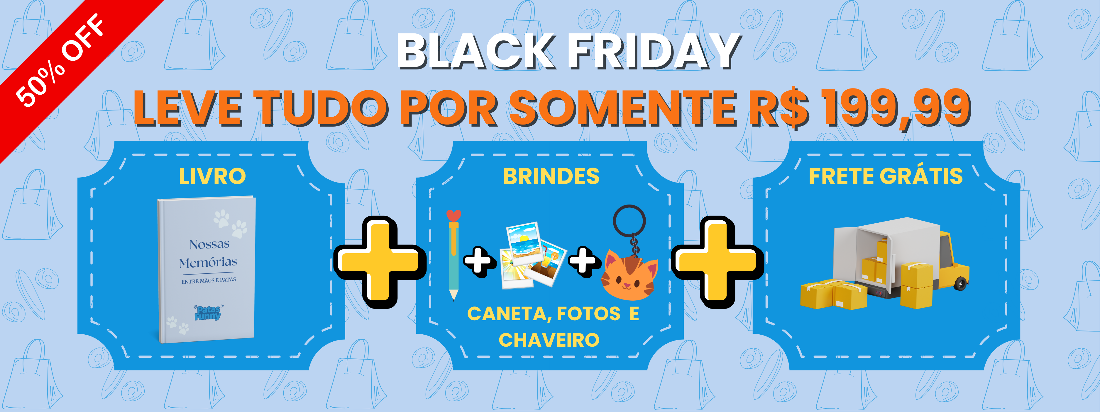 Cada livro vem acompanhado de brindes físicos especiais da Patas Funny. São pequenos mimos que fazem toda a diferença e demonstram nosso carinho por você e seu pet.